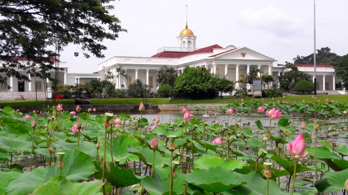 We proberen de auto’s te vermijden door de kleine paden te zoeken, hetgeen nog niet meevalt want het hele park is zeer gecultiveerd. Op een gegeven moment staan we bij een monument voor vier palmbomen. Deze vier bomen zijn als kweek-basis verantwoordelijk voor de verwoestende opkomst van de plantages van palmolie in heel Zuidoost Azië. Botanisch gezien wellicht een prestatie, maar een monument voor de dagelijks vernietiging van tropisch oerwoud? We rusten wat uit op een bankje, het is drukkend heet en we kijken naar de vijvers vol lotusbloemen en het paleis op de achtergrond. Prinses Juliana en prins Bernhard hebben er ooit gelogeerd. Geen slechte homestay.