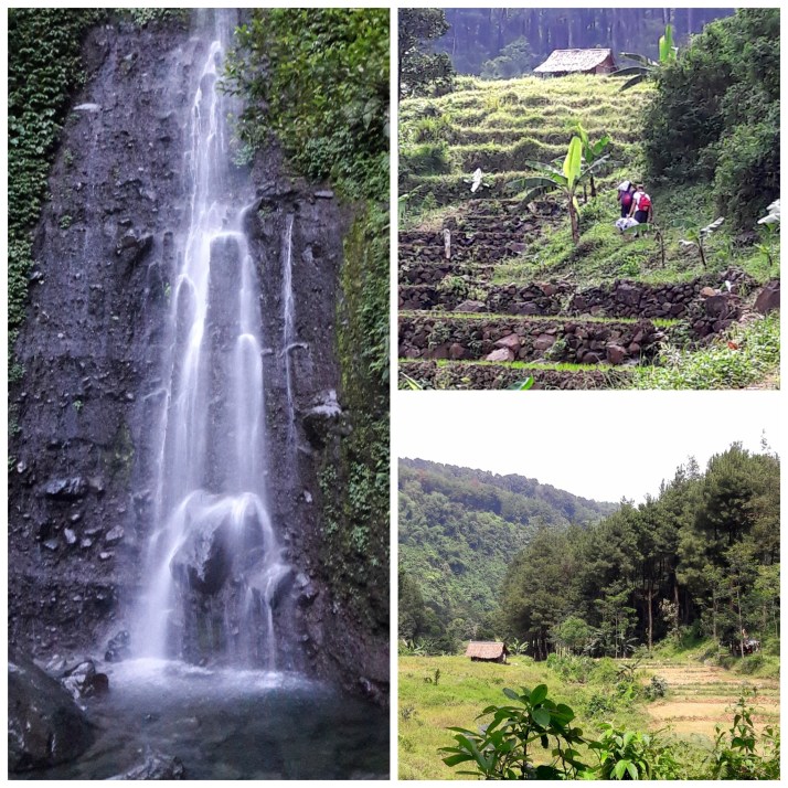 De volgende dag zitten we al weer om 04.00 uur ongewassen aan het ontbijt, want we gaan douchen onder een waterval. Tom neemt ons namelijk mee naar zijn bamboehutje in de sawah ergens op de berg Gunung Salak, die ruim 2100 m hoog is. Om half 5 stappen we in de auto om zo de file in Bogor te vermijden. Onze chauffeur Lucky, tevens Toms buurman, rijdt ons naar boven. We willen voor de grote vakantiemeute bij de waterval zijn en stappen om 05.30 uur het donker in, gewapend met zaklantaarns. We klimmen stevig via een min of meer aangelegd pad met treden van boomwortels en stenen. Om 6 uur staan we onder de waterval te douchen die vanaf 30 m op ons neerklettert, heerlijk!