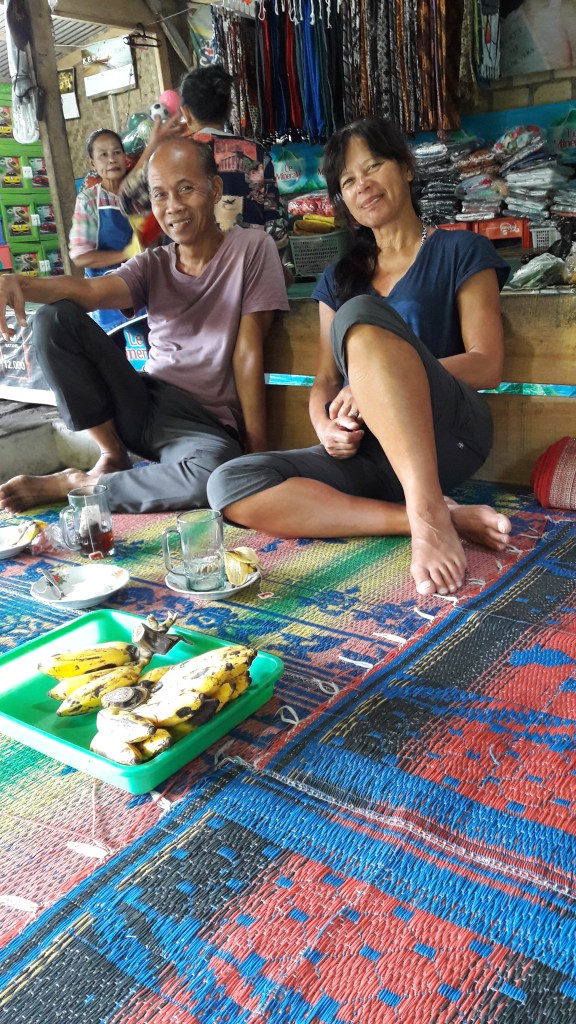 “Kun je hier ook slapen?”, vraagt Ina aan een jonge dame die naar ons toe loopt. Op internet konden we geen accommodatie vinden. “Jazeker”, zegt ze lachend en ze opent de deur van één van de twee kamers die zij verhuurt. Het ziet er zeer eenvoudig en schattig uit. Het tweepersoonsbed past er precies in en voor het bed is net genoeg ruimte voor de rugzakken. Aan de muur hangen een paar haken en twee planken. Meer heb je niet nodig voor een verblijf. Het sanitair is buiten om de hoek en deel je met je buren. Toilet en doucheruimte zijn van elkaar gescheiden. Om te douchen kun je zelfs kiezen: onder een douche-kop staan of, zoals lokaal gebruik, met het water uit de emmer mandiën door water over je heen te gieten. Voor de kamer is een zitje, bestaand uit een houten tafel en boomstammen om op te zitten. Privacy is gecreëerd door een laag hardhouten hek. “Het is net een maand geleden op-geleverd,” zegt de jongedame trots die Acha heet. We vinden het aandoenlijk. Niet alleen de kamer, maar vooral ook de ontspannen sfeer die we proeven. “En wat vraag je voor één nacht, Acha?”, vraagt Ina nieuwsgierig. “Dua ratus limah puluh ribu”, antwoordt ze. “Oh, 250.000 rupiah, Jeroen. Dat zijn nog eens leuke prijzen voor een fantastische plek.” “En voor drie maaltijden bereken ik 150.000 Rp. per persoon,” vervolgt Acha haar PR-praatje. Het klinkt aantrekkelijk. En aan de heerlijke geur van eten die meteen onze eetlust doet opwekken, schatten we in dat ze goed kan koken. Hadden we dit adresje maar eerder geweten.