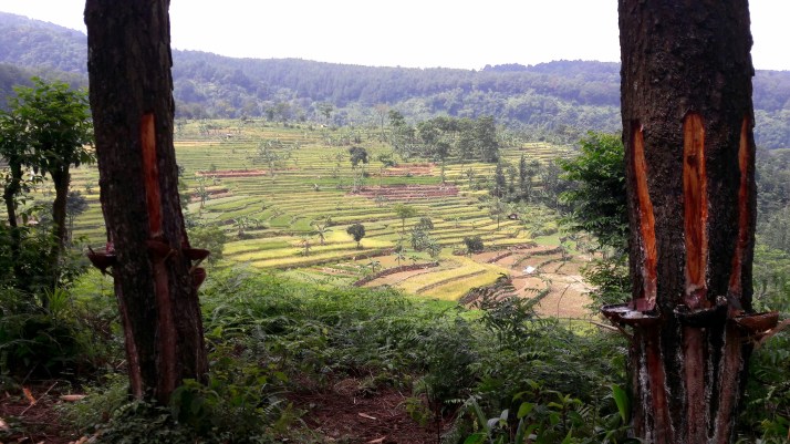 De volgende ochtend wassen we ons in de badkamer (helder water in de beek), eten weer witbrood en drinken thee van de buurman in onze zomerkeuken (het afdakje). We pakken vervolgens alles in en lopen door het bos terug naar de kampong beneden. Het bos bestaat hier uit naaldbomen, zo hoog zitten we. Het is grove den die massaal wordt afgetapt. De hars geurt heerlijk en wordt hier gebruikt voor het produceren van lijm. We genieten van de uitzichten op het dal en zien Bogor liggen. Volgens afspraak staat Lucky weer op ons te wachten en hij brengt ons naar Toms Homestay.