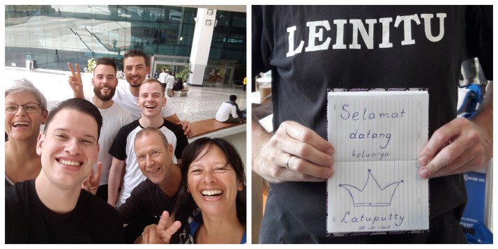 Intussen is het vliegtuig van de familie al geland en moeten we met de transferbus naar een andere terminal om Joël, Sven, Marc, Stephan, Rhani en Peter te kunnen verwelkomen. Op tijd staan we klaar met ons welkomstbord: ‘Selamat datang keluarga Kroon & Latuputty’. We regelen 2 taxi’s en we worden vlot afgezet bij het Zest Hotel. Ina vertrekt echter per ommegaande weer naar het vliegveld, want Tom uit Bogor heeft het voor elkaar gekregen dat Ina tòch het geld mee kan krijgen. Huh? Ze moet opschieten, want het kantoor sluit om half 3. Vlak voor de bank krijgt de shuttle helaas een lekke band en ze heeft nog drie minuten. Snel stapt ze een transferbus van de airport in die net komt aanrijden en net voor sluitingstijd glipt ze het kantoor in. Al met al duurt het nog wel twee uur voordat de bankmedewerkster de 2 miljoen voor haar uittelt en in een grote envelop aan haar overhandigt. Vervolgens snelt Ina naar buiten en wacht op de transferbus die haar naar gate 3 van Garuda brengt om de vliegtuigstoelen voor morgen te reserveren. Met een taxi rijdt ze terug naar het hotel. Inmiddels is het etenstijd en we genieten samen van een heerlijke rijsttafel. De jongens besluiten terug te gaan naar de luchthaven om onze neef Dominggus en zijn vriendin Naomi te begroeten die terug vliegen naar Nederland. De ‘ouderen’ kruipen het bed in. Morgen weer vroeg op en dan vliegen we naar de Molukken!