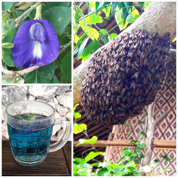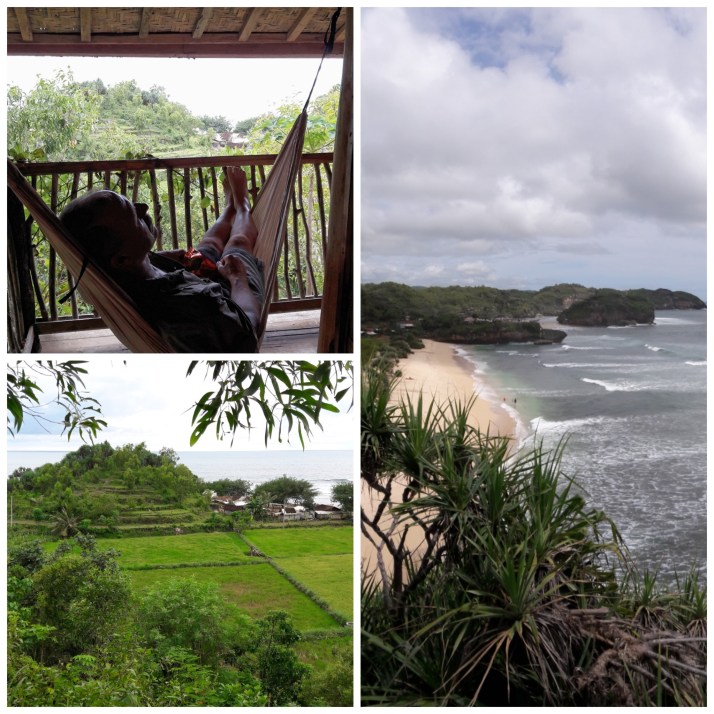 De zee heeft een stevige golfslag en er wordt gewaarschuwd voor de sterke stroming. We blijven dus wat aan de rand van het water, kijken naar de vissers, lezen wat en de dag verglijdt. Onze kamer ligt op de heuvel en is een twee-onder-één kap. Het is volledig opgebouwd uit bam-boe. De voorzijde kan helemaal worden geopend, zodat de kamer overgaat in de veranda. We kijken uit op het dorpje en de zee.