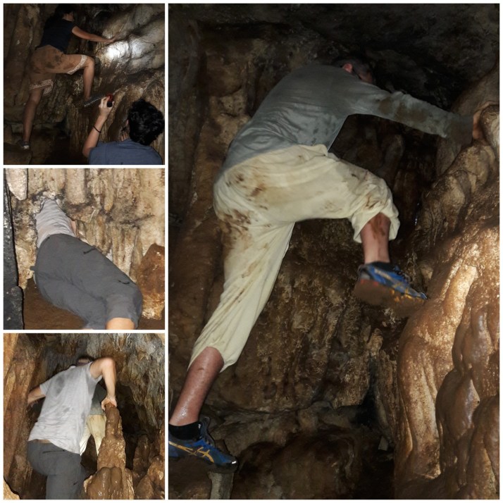 De volgende dag gaan we met Renzo en Sara op stap: Ira heeft namelijk een programma voorgesteld. We gaan naar druipsteengrotten, eten in het dorp en sluiten af met gamelan muziek. De auto brengt ons door sawahs de heuvels in en iedereen groet Ira hartelijk; ze is duidelijk geliefd bij de bevolking. Om bij de grotten te komen, lopen we met de gids een klein stukje het oerwoud in en klauteren dan een kuil in met de eerste stalagmieten. De zaklantaarns gaan aan en we trekken de grot in. Het is vochtig warm en de bodem bestaat uit super glibberige klei en waterplassen. Al gauw staan we voor een gat in de wand, niet groter dan het formaat van een wc-raampje. De gids en Ira wurmen zich er op hun buik door heen, maar dan moet Renzo: 2x zo groot en breed als de gids! Hij twijfelt: “I’m not sure if I wonna do this”. Toch werpt hij zich in de klei en als nog de helft van Renzo zichtbaar is, horen we een verstikt en paniekerig: ”I’m stuck!”. Met veel gedoe weten we Renzo te bevrijden. Jeroen kiest eieren voor z’n geld en roept door het gat naar de gids en Ira: “Het gaat ons niet lukken, hoor. Wij westerlingen zijn veel te groot.” Het hoofd van de gids komt tevoorschijn en zegt met een brede grijns dat er nog een andere weg is…. Tamelijk onzeker vervolgen we onze barre tocht door de ingewanden van Java. We zweten allemaal hevig en we zitten onder de modder. Opnieuw staan we voor een smalle opening. “Behalve hoogte- en dieptevrees heb ik geloof ik ook last van claustrofobie,” zegt Ina zachtjes tegen Jeroen. Maar ze zet zich er moedig overheen en ze wurmt zich door de nauwe opening. We gaan op in de omgeving: grillige rotsen, stalagmieten en stalactieten die we beschijnen met onze zaklantaarns, terwijl de vleermuizen om ons heen fladderen.