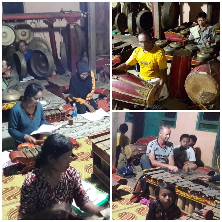 Het is zò indrukwekkend, dat we beginnen te fluisteren met elkaar. Ira vertelt: “Er is een man uit het dorp die net zoals de bewoners dat vroeger deden, dagen in de grot verblijft om te mediteren.” Het lijkt ons verre van prettig om te bivakkeren in een kleine, donkere, benauwd vochtige ruimte. De expeditie weet via klimmen, afdalen, kruipen, glijden, elkaar bijschijnend de uitgang veilig te bereiken. Duidelijk opgelucht en euforisch maken we een groepsfoto en kijken stukjes video terug. Wat een belevenis! De ergste modder kunnen we van ons afspoelen en we gaan naar het dorp voor teh en pisang goreng. We eten pecil, een pittige variant van gado-gado. Eigenlijk zijn we al voldaan en hebben niet zo heel veel zin in de gamelan, maar men rekent op ons, dus we gaan naar de oefenruimte. Als alle instrumenten zijn klaargezet, gaan we repeteren.