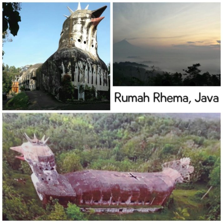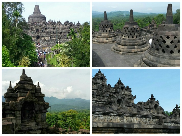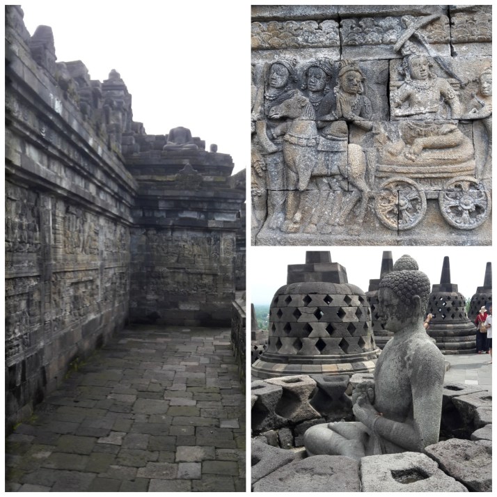 We besluiten de heuvel te verlaten en wandelen richting de Rumah Rhema, een kerk- en gebedsruimte in de vorm van een (vredes)duif. Jeroen noemt het oneerbiedig een kip. Het is een heel bijzonder gebouw dat is gebouwd in 1992 en het biedt ruimte aan verschillende religies, zoals Hindoeïsme, Islam en Christendom. We gaan de trap op en hebben vanuit de snavel uitzicht over de bergen. Aan de andere kant van het gebouw nuttigen we ons ontbijt: koffie met gebakken cassave. De Borobudur heeft een UNESCO-status en mede daardoor zijn de opgravingen en restauraties zeer geslaagd. Het gehele complex is ook keurig en efficiënt aangelegd, met toegangspoorten voor VIPs, security, parkeerplaatsen voor bussen, eettentjes, souveniersmarkt, rondrijdend treintje, kortom: men is duidelijk ingesteld op dagelijkse grote stromen bezoekers. Het bouwwerk bestaat in feite uit 3 spirituele niveaus: de eerst bouwlaag verbeeldt het loskomen van wensen en verlangens, de tweede bouwlaag verbeeldt het vrij zijn van wensen met nog een menselijke gedaante en de derde laag verbeeldt het Nirvana: vrij van wensen en menselijke vorm. Het Nirvana is rond gebouwd, terwijl de andere bouwlagen vierkant zijn.