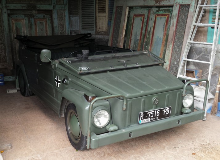 Het is een Duits cabrio legervoertuig, gebouwd tussen 1968 en 1980. De motor zit achterin. Als mas Bedhot de motor start, horen wij het typische geluid van een kever. Vol trots rijdt hij ons naar het uitgaansleven en onderweg trekken wij de aandacht. Geïnteresseerd luistert Jeroen naar de bijzonderheden die mas Bedhot over het voertuig weet te vertellen en over zijn volkswagenbus, type T2. Hij is lid van de volkswagenclub in Yogya en regelmatig wordt er een tour georganiseerd. Dat moet een bijzonder gezicht zijn, al die gekleurde volkswagenbusjes rijdend door de bergen. Ina kletst met de jongelui en we stellen elkaar de typische reizigersvragen: waar kom je vandaan, waar ga je naar toe en hoe lang ben je onderweg.