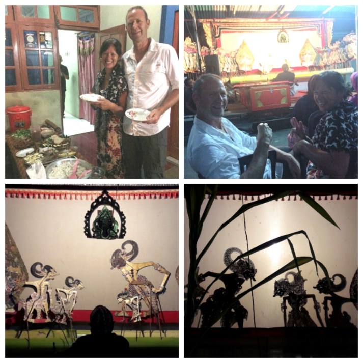Naast de Homestay is een podium opgericht voor een wayang kulit, een voorstelling met wajangpoppen. Het blijkt ter gelegenheid te zijn van het buurtfeest vanwege oudejaarsdag. In Indonesië bestaat er geen feest zonder maaltijd en altijd word je uitgenodigd om mee te eten. Achter de wajangvoorstelling zien we dat er voor alle buurtbewoners uitgebreid is gekookt. Het ziet er heerlijk uit en de ibu-ibu sporen ons aan om veel op te scheppen. Met een vol bord en warme thee worden we uitgenodigd om op de voorste rij te gaan zitten. Bij een traditionele wajangvoorstelling luistert men naar eeuwenoude verhalen afkomstig uit de Hinducultuur, verteld in het Javaans en ondersteund door Javaanse gamelanmuziek. Meestal duurt het vanaf het begin van de avond tot ver in de ochtend. Deze wajangspeler heeft er een variant op. De gamelanmuziek komt uit een geluidsinstallatie, hij vertelt zijn eigen verhaal waarbij hij het publiek betrekt en met veel humor inspeelt op hun opmerkingen. De bewoners schaterlachen om zijn grap-pen. Het schouwspel doet ons denken aan de oudejaarsconference in Nederland, maar dan net even anders. De voorstelling is nog niet afgelopen, maar mas Bedhot ziet dat we zijn uitgegeten. De hoogste tijd om te vertrekken. Samen met een ander jong stel uit Nederland stappen we in zijn groene Volkswagen, type 181.