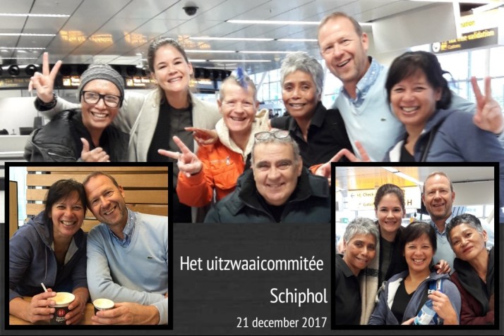 Onze reis van vier maanden begint in Gieterveen. We starten in Indonesië, vliegen door naar Nieuw-Zeeland en reizen via Singapore en Indonesië terug naar Nederland. Onze rugzakken zijn gepakt en liggen in de auto van Ma Schuitert. We brengen haar auto naar Zwolle, drinken samen nog even koffie, pakken dan onze rugzakken op en wandelen naar het station. Soepel verloopt de treinreis vervolgens naar Schiphol.