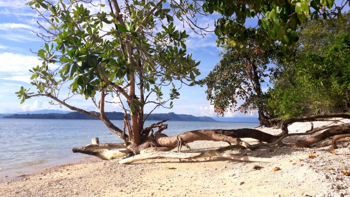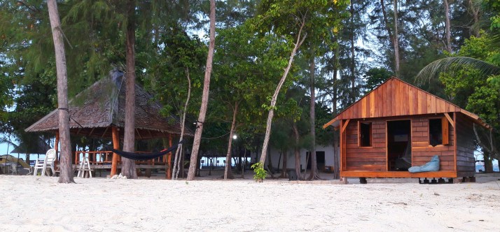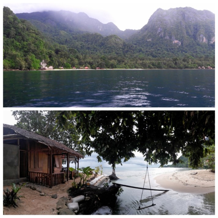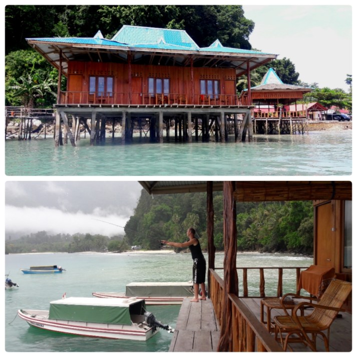 Na twee uur arriveren we in Saleman. De auto stopt voor het resort, wat bestaat uit een overdekt restaurant en drie aaneengeschakelde ruime kamers op palen in zee. Koko verwelkomt ons in het Engels en hij brengt ons naar de kamer. “Where do you want to sleep?” Er zijn geen gasten en we mogen zelf weten waar we willen slapen. We kiezen de middelste kamer. De kamers hebben samen één grote veranda met elk een eigen zitje. We hebben geen idee wat er voor ons ligt. Nu kijken we uit op een groot zwart gapend gat met in de verte lichtjes. Morgen zullen we zien waar we zijn terecht gekomen.