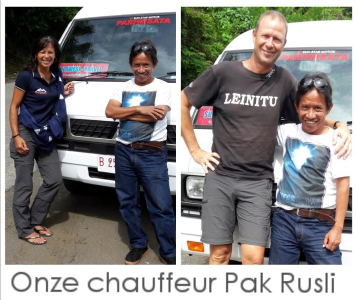 Terug naar Toms Homestay pakken we een angkota, een taxibusje. Dit zijn allemaal identieke felgroene Suzuki mini-mini-busjes, niet berekend op het postuur van een westerling. Diep door de knieën kruip je in de zitruimte en neemt plaats op de kleine bankjes die tegenover elkaar zijn opgesteld. Als je eenmaal zit, heb je de dijen tegen je borstbeen. Twee jongelui springen op een gegeven moment naar binnen met een ukelele en gaan liedjes zingen. Ina kent het liedje en zingt mee. Uiteraard gaat de pet rond en wordt voor Jeroen gehouden. Er ligt een muntje in en prompt pakt Jeroen deze uit de pet en zegt: “Terima kasih”. De jongen kijkt verschrikt met grote ogen, totdat het hele busje in lachen uitbarst. Met gevulde pet springen ze vrolijk uit ons busje om meteen in de volgende te springen. Met Tom eten we de opgehaalde maaltijd: ayam bakar van houtskoolvuur, sambal goreng tempé (Ina’s favoriet), telor goreng (gebakken ei), nasi goreng en natuurlijk sambal bij. We duiken op tijd het bed. Morgen hebben vervoer geregeld naar Cisolok en we vertrekken vroeg.