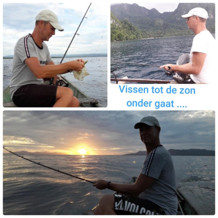 Er is van alles te zien. We hebben een juiste keuze gemaakt om naar dit plekje te reizen en boffen dat we dit natuurlijk schoons mogen aanschouwen. Dat besluiten we vandaag dan ook maar te doen. Vanaf de veranda genieten we volop, ondanks dat het zwaar bewolkt is en het veel regent. In het Zuidfranse Baron maken we er een sport van om niet van het land af te komen, hier in Saleman zijn we de hele dag niet aan land geweest. Het restaurant waar we de drie maaltijden nuttigen, bereiken we via de steiger. We vervelen ons geen moment. Het is een komen en gaan van boten die vooral lokale toeristen vervoeren naar bijzondere plekjes in de baai. Jeroen gooit zijn hengel uit. “Ja, ik heb beet!”, roept hij al gauw. Warempel! Ina ziet een wild spartelende middelgrote vis aan de haak hangen. De vis beweegt echter zo wild, dat hij los komt en terug valt in zee. Dat is nou een typisch geval van jammer. Jeroen doet nog vele pogingen, maar de vissen happen niet. Aan het eind van de dag zien we verderop in zee de vissen in groten getale vrolijk rondzwemmen. “Eén dezer dagen zal ik met een bootje de zee opvaren en vis vangen,” zegt Jeroen resoluut. We gaan het vast beleven. Na een rustdag wordt het tijd om iets te ondernemen. Wat moet je doen als er door de steile bergwanden geen wegen zijn en de zee voor je ligt? Juist, we huren bij Koko een boot die ons naar interessante plekjes brengt. Allereerst varen we naar een rotswand die vanuit zee verticaal omhoog doemt. Het zeewater golft hoog tegen de rotsen en trekt zich daarna behoorlijk terug. Koko wijst ons op een deel waar de rots goed is te zien. Hij zegt dat het mogelijk is om de onderwatergrot in te zwemmen. Helaas gaat dat door de behoorlijk sterke stroming door het getij nu niet lukken. Je zou zo tegen de rotswand worden gesmeten. “Kijk,” zegt hij, wijzend op zijn mobiel. “Ik heb er een foto van gemaakt.” De afbeelding ziet er indrukwekkend uit, maar voor nu blijven we uit de buurt van de grot.