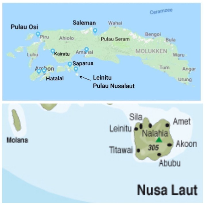 Nusalaut is het kleinste eilandje van de Zuid-Molukken. Feitelijk liggen de eilanden centraal in het Molukse eilanden-gebied en staat het op de landkaart genoemd als Maluku Tengah, Midden-Molukken. Haruku, Saparua, en Nusalaut worden gezamenlijk Lease genoemd. Nusalaut heeft de vorm van een cirkel. Het is er bergachtig, ondoordringbaar en vanaf zee zie je 305 m boven zeespiegel de hoogste top Lawakano op-doemen. De oppervlakte is slechts 12 km2, de kust heeft een lengte van 24 km. Eigen en aardrijkskundige namen worden regelmatig met twee namen aangeduid. Het kan een verbastering/afkorting zijn (Martin wordt Ateng) of de oorspronkelijke naam is vervangen door een nieuwe. Het dorp Leinitu droeg vroeger de naam ‘Henasiwa Hata Lepu’ en het dorp Sila werd genoemd ‘Hena Siwa Hata Lepu Pewaai’. Nusalaut werd genoemd ‘Nusahulawano’ wat Goudeiland betekent. Met het busje maken we een rondje om het eiland. De chauffeur heeft met zijn busje een monopolypositie in de twee dorpen. Hij rijdt de kinderen naar de middelbare school in Ameth of Titawaai, vervoert de mensen van en naar de ferry in Ameth en nu gebruiken wij het als Bus Pariwisata, de toeristenbus. Gelukkig hanteert hij normale prijzen, wat je niet zou verwachten als er slechts één busje rondrijdt. Jan en alleman wil mee, dus zitten we dicht op elkaar te zweten. Joël heeft waarschijnlijk de allerbeste plek. Hij zit achterop de brommer bij Ricardo uit te waaien en om zich heen te kijken. Met zijn lengte van 1,91m is het ook geen pretje om in een klein busje te zitten. We stappen bij elk dorpje uit en zien een warm waterbron in Sila, bezoeken het huis van oma Corrie Leiwakabessy in Nalahia waar nu niemand woont, leveren paracetamol af bij familie van Nane Metekohy in de hoofdplaats Ameth, gaan op zoek naar familie van Herrie Souhuwat-Holle in Akoon, bezoeken het standbeeld Martha Christina Tiahahu in Abubu, vrijheidsstrijdster tegen de Nederlanders, we rijden door het dorpje Titawaai en komen na 4 uren terug in Leinitu. Wat een timing, precies op tijd om te lunchen.
