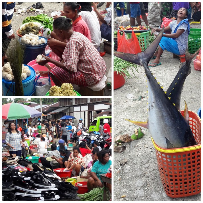 Joël en Jeroen hebben een hengel meegenomen en dus wordt er gevist. Sven, Marc en Stephan stappen ook in de boot. Ze passen er net in. De verwachtingen zijn hoog. Er zit zoveel vis in zee, dat we zeker weten dat we die avond worden getrakteerd op ikan bakar. Keer op keer wordt de lijn uitgegooid. Maar helaas, er wordt niets, maar dan ook niets gevangen. Dan zien ze opeens op enkele tientallen meters afstand wel 30 dolfijnen uit het water springen. Wat een prachtig gezicht! Het maakt het boottochtje weer helemaal goed. De volgende dag maakt Ina een ander boottochtje, want ze gaat met Stephan boodschappen doen op de markt in Saparua. Het is een drukte van belang en er is een grote bedrijvigheid. Altijd leuk om een markt te bezoeken. Bepakt met alle boodschappen voor de komende dagen varen we in drie kwartier terug.
