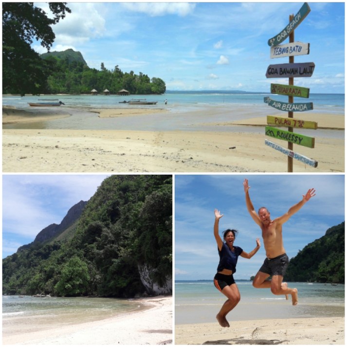 We hebben de snorkels meegenomen die we voor vertrek nog snel hebben aangeschaft. Daar zijn we blij mee, merken we als we het water in duiken. Onder ons verschijnt de wondere wereld van koraal, zeesterren, zee-egels en tientallen vissen in alle soorten, kleuren en maten. Door al dat moois weet je gewoon niet waar je naar toe moet zwemmen en waar je als eerste naar moet kijken. Het blijkt al gauw dat het het beste is om languit in zee te blijven hangen, je ogen de kost te geven en het op je eigen harde schijf in te prenten. We krijgen er geen genoeg van. Maar er is meer te zien. Morgen verkassen we naar Ora Beach Resort. Vanuit Saleman hebben we het aan de overkant zien liggen: zeven huizen op palen in zee en idem dito een restaurant, gelegen aan een wit zandstrand. “Willen jullie er alvast een kijkje nemen?,” stelt Koko voor. We kijken elkaar aan. “Ach, waarom ook niet,” zegt Jeroen. “Als het niets is, dan kunnen we altijd nog in Saleman blijven of iets anders zoeken,” grapt Jeroen. Op internet hebben we prachtige foto’s en filmpjes gezien. Het is waarschijnlijk het duurste onderkomen in de regio en wellicht van onze hele reis, maar we willen het onszelf niet onthouden. De boot meert aan op het strand en een jongeman verwelkomt ons hartelijk. “Selamat datang.”
