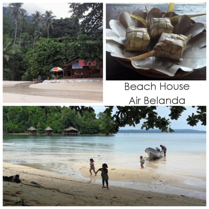 Op naar het volgende strand: ‘Air Belanda’. Je zou denken dat het allemaal eender is, maar niets is minder waar. Het strand met een lengte van een paar honderd meter loopt in een flauwe bocht en is afgescheiden door een rotswand aan de ene kant en een groen bedekte rotsheuvel aan de andere kant. Pal aan zee staan een paar eenvoudige huisjes bij elkaar, ingericht als restaurant en winkel. Verderop staan op een rij drie houten huizen op palen in zee. Er straalt een serene rust uit over deze baai en behalve de lokale bevolking zien we verder niemand. We lopen tussen de houten gebouwen door waar een beek met een haakse bocht en een behoorlijke stroming de zee instroomt. We proeven het zoete water en liggen languit in de heldere en koele beek. Wat een aangename verassing. Het is veel frisser dan het warme zeewater. Hierdoor koelen we heerlijk af en we zijn voor even de hitte en klamheid kwijt.