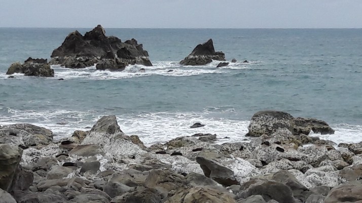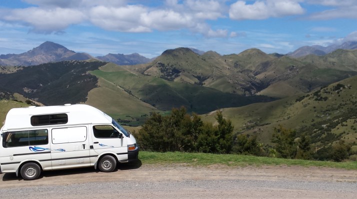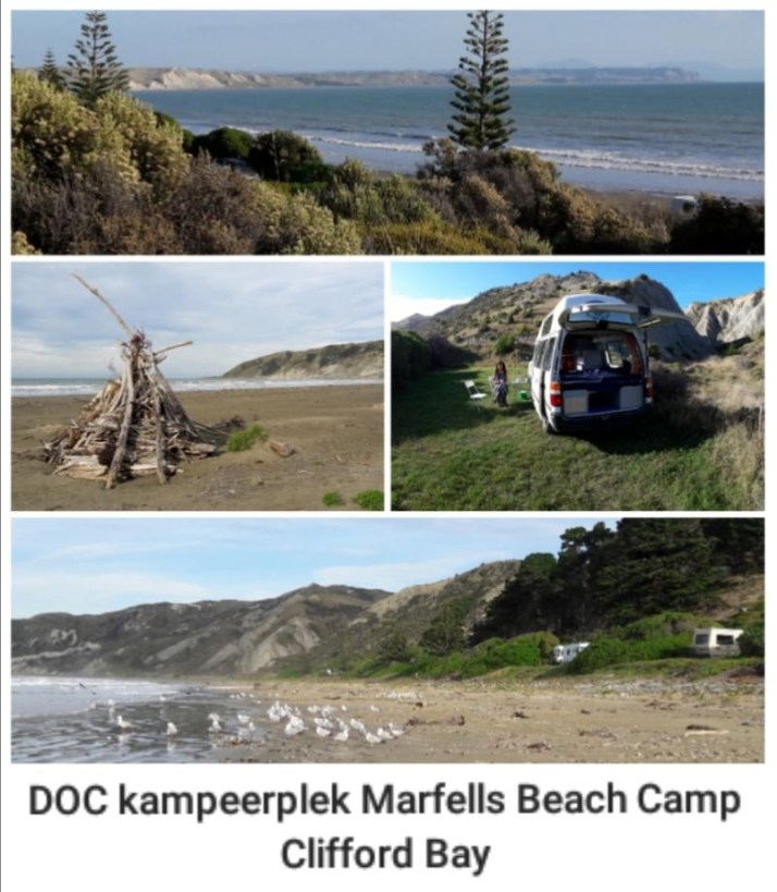 Aan de kust met kiezelstranden vinden we een campsite waar je maximaal 2 overnachtingen mag staan. De plek ziet er netjes uit en heeft goede toiletten. Een donatie wordt zeer gewaardeerd. De plaatsen direct aan zee zijn al bezet en dus zetten we de Toyota wat meer uit de wind.