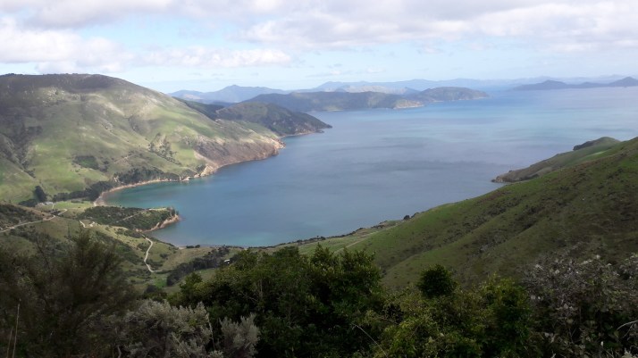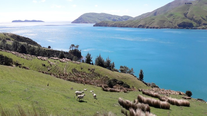 De weg kronkelt over de heuvels en we komen aan op de plaats van bestemming. De eigenaren zijn niet thuis, maar een briefje op de deur laat weten dat we ons op het kampeerterrein kunnen settelen. We menen dat het terrein aan het water ligt en rijden via de steile weg naar beneden. Halverwege denken we dat we niet goed zitten. Jeroen neemt poolshoogte en loopt naar de zee. Als hij terug komt, gebaart hij dat we moeten keren. Er is daar niets wat wijst op een kampeerveld. Met enige moeite draaien we de camper, want het is smal, steil en glad. Met flink gas en slippende banden rijden we terug omhoog en zien dan dat we even verderop naast het veld met de schapen kunnen staan. Met uitzicht op de inham (inlet genoemd), boten en strandjes. Ook mooi!