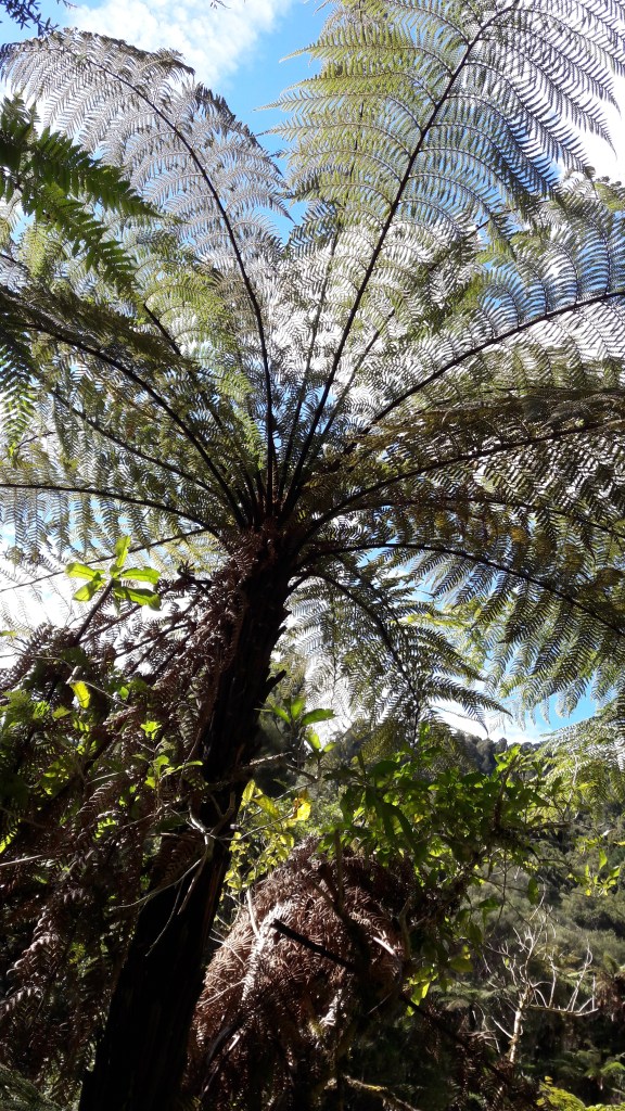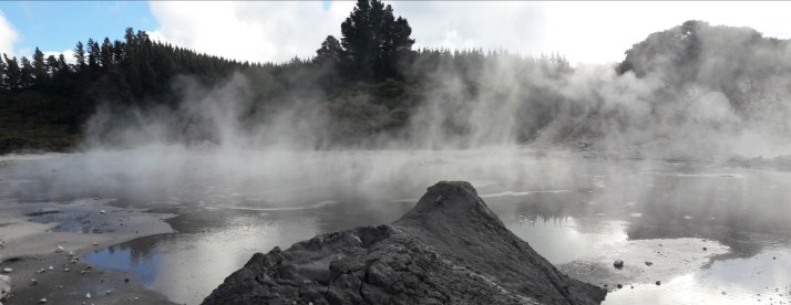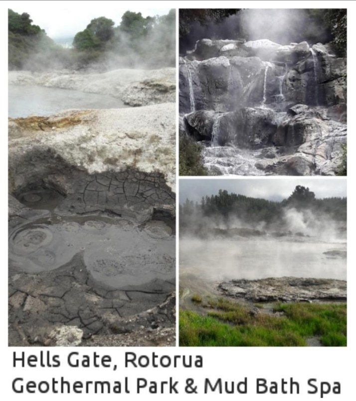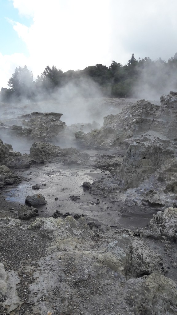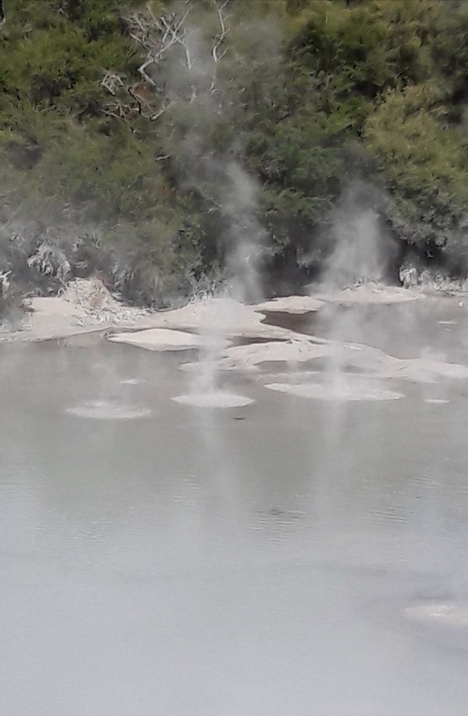 De route gaat door een soort landschap dat we al goed kennen van het Noordereiland: scherpe heuvels met steile hellingen en smalle dalen waar de weg zich doorheen slingert. Zoals in heel Nieuw-Zeeland is het overgrote deel van het oorspronkelijke regenwoud gekapt en de heuvels zijn begroeid met fris groen gras voor de veeteelt en het heeft daardoor veel weg van Schotland. Ook is er sprake van eindeloos productiebos met de daarbij behorende houtkap en aanplant van nieuw naaldhout. Zodra we een strook regenwoud inrijden, wanen we ons in een andere wereld: een ondoordringbare groene wand met hoge boomvarens, palmbomen, bomen met luchtwortels en variëteiten aan mossen. Als we zo’n strook weer uitrijden en we vervolgens door een gebied met productiebos komen, is het contrast voor ons steeds weer (te) groot. In de loop van de middag bereiken we de regio, Bay of Plenty genoemd, met veel geothermische activiteit. We gaan naar Hells Gate en kopen een duur ticket voor entree, inclusief spa met modderbad. Tja, we zijn er nu eenmaal toch….