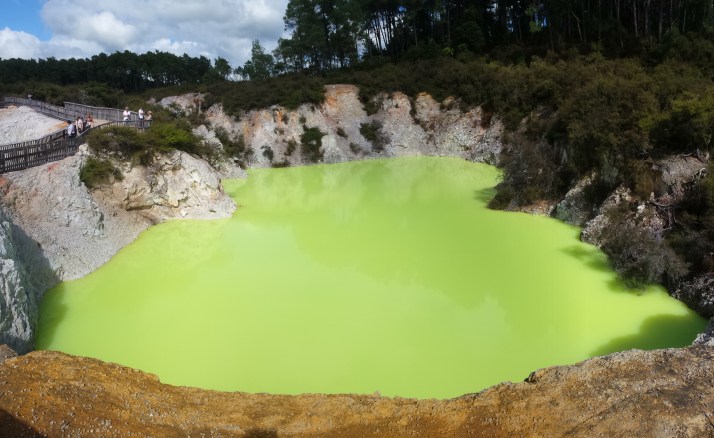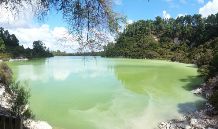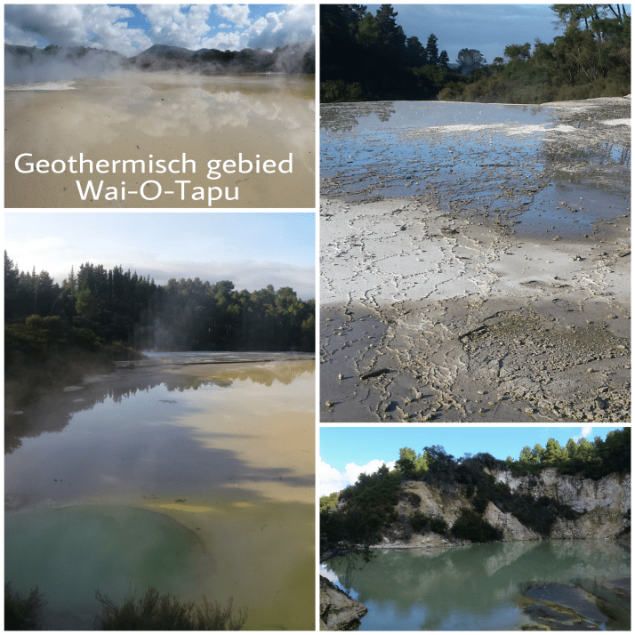 We gaan vroeg naar Geothermal Wonderland Wai-O-Tapu om zodoende de stroom bezoekers voor te zijn. Inmiddels hebben we ervaring met toeristische trekpleisters. Het trekt vooral Aziaten in grote getale aan die allemaal selfies willen maken in allerlei poses, terwijl wij natuurfoto’s willen zonder mensen erop. Ons plannetje pakt uitstekend uit en we genieten volop van de onwerkelijke thermische poelen in de meest prachtige kleuren, zònder poserende Aziaten. Woorden schieten tekort en we krijgen er geen genoeg van.