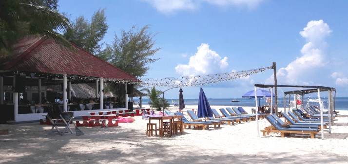 Het luxe hutje staat op het strand met uitzicht op een ander klein eilandje. Achter ons staat de eetbar, genaamd ‘CoCo’s Beachclub waar voortdurend muziek uit de geluidsboxen klinkt, compleet met ligstoelen, hangmatten en een schommel in het water. Van hieruit stap je zo de zee in. Het ondiepe water kleurt bij het strand fel azuurblauw en in het diepere deel van de zee donkerblauw, hetgeen een mooi contrast oplevert. De wuivende palmen complementeren het geheel, zodat je terecht kunt spreken van een ‘Bounty-eiland’. Dit is precies wat we zochten.