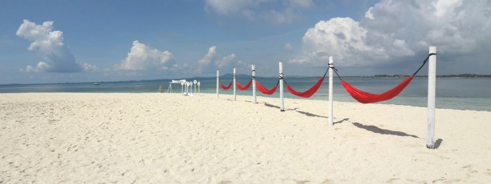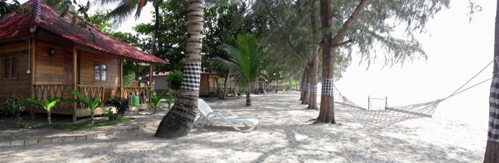 Het resort ligt er schitterend bij. De paalwoningen en het restaurant zijn opgetrokken in traditionele stijl, gebouwd van tropisch hardhout met een dak van atap, palmbladeren. Op het strand staan zes huisjes die twee aan twee aan elkaar zijn geschakeld. Strandbedden nodigen uit om er een middagdutje te doen, er hangen schommelbanken, schommels aan lange touwen en op de stam van de over zee gebogen palmboom, zien we treden die leiden naar een veranda in de vorm van een groot hart. Vanaf hier heb je uitzicht over het resort. Het valt op dat het personeel een uniform draagt. Dit alleen al doet een luxe onderkomen vermoeden waar het management vast en zeker aandacht besteedt aan een goede service voor zijn gasten. We denken dat we het er wel een paar dagen zullen uithouden. Als we weg gaan, lezen we dat daggasten per persoon Rp. 25.000,00 (€ 1,50) moeten betalen. We worden op het bord gewezen, maar we negeren de aanwijzing en stappen de boot weer in.