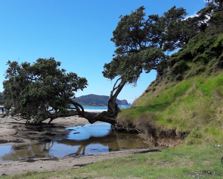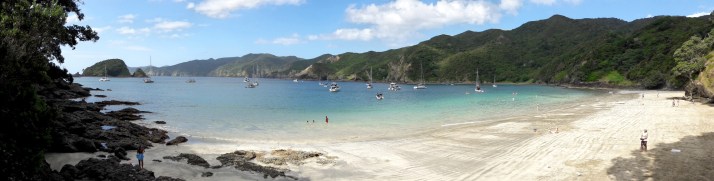 We stappen in de zeilboot ‘Vigilant’ die klaarligt en geven de acht andere gasten een handje: twee dames uit Auckland en stellen uit Australië, Duitsland en Frankrijk. Op motorkracht varen we de zee op en door te weinig wind doet het zeil niet veel. Na een klein uur varen gaan we voor anker in de baai van Motuarohia, ook wel Cook’s Island genoemd omdat kapitein Cook in 1769 hier als eerste Europeaan voet aan wal zette. Ze werden omsingeld door Māori’s en meteen zijn er toen vier Māori’s dood geschoten. Later realiseerden de Māori’s in dit gebied zich dat Cook kwam voor de handel en ze gaven hem toestemming het gebied te betreden. Cook noemde vervolgens dit gebied Bay of Islands.