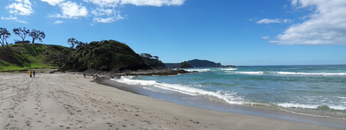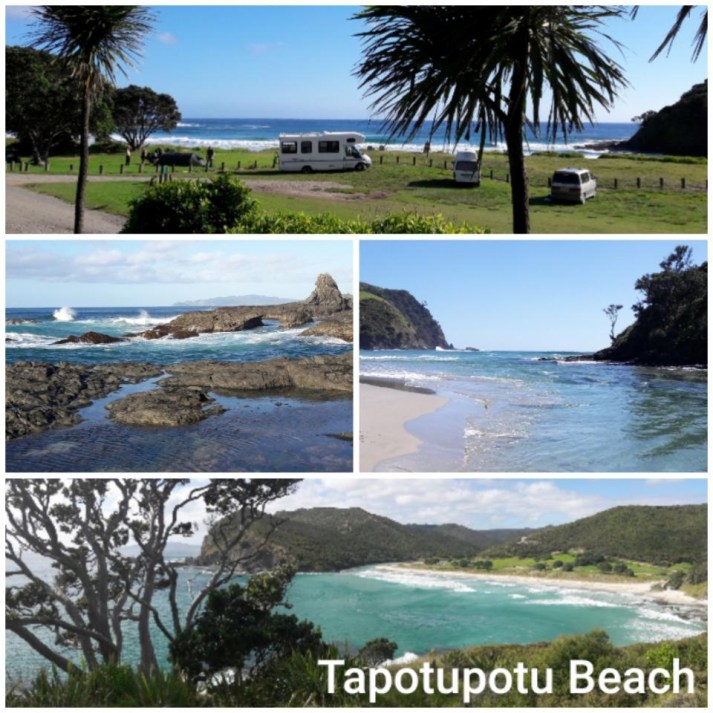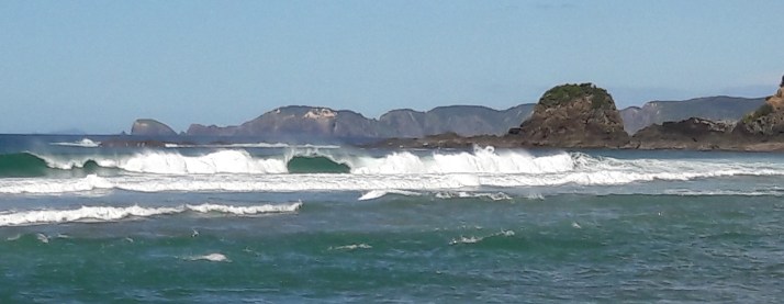 We gaan op weg naar het noorden en willen in ieder geval voorbij Auckland komen en wellicht nog verder, want daar schijnt het mooi weer te zijn. Al ver voor Auckland wordt het druk en zien we links en rechts van ons huizen, gebouwen en industriële activiteit. Niet veel aan dus en we nemen de vierbaans snelweg die er goed uitziet met tunnels, bruggen en viaducten. Hiervoor moeten we tol betalen, lezen we op verschillende informatieborden en we leggen de $2,70 al vast klaar. Er komt echter geen tolpoortje. Bij een benzinestation gaan we een kop koffie drinken en we informeren bij de Chinese dame achter de toonbank hoe dat nou zit met die tol en waar we moeten betalen. Ze spreekt echter amper Engels en ze heeft geen idee waar we het over hebben en dus rijden we door. “Dit voelt niet goed,” zegt Ina, “Hier gaan we nog problemen mee krijgen. Er is vast een soort automatisch registratiesysteem.” “Welnee joh,” zegt Jeroen, “voor die paar dollies?” Tegen de avond slaan we bij Ruakaka aan de oostkust af, richting strand, want daar mogen we één nacht gratis staan. We rijden de parkeerplaats op van de duinovergang en zien al vijf campers dicht bij elkaar staan. Er is nog net één plaatsje voor ons over, dus we parkeren en gaan meteen naar het strand en kijken naar surfers in de golven. Altijd leuk om te zien. Het is een mooie ruime baai met fijn zand, flinke golfslag en een spectaculair uitzicht op de kliffen en eilandjes.