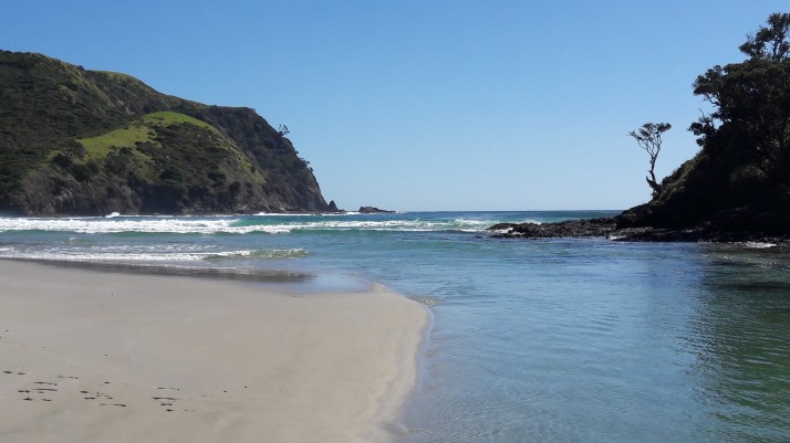 Ook boeiend om te zien is dat de Tasmanzee en de zuidelijke Pacific elkaar hier ontmoeten: van links komen de golven van de Tasmanzee en van rechts vanuit de Pacific. Ter hoogte van de vuurtoren botsen deze golven schuimend tegen elkaar. De rest van de dag brengen we luierend door in ‘onze’ baai.