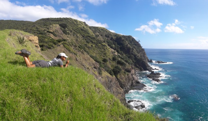 Op de klif op een strook kort gras gaan we pauzeren en genieten volop van het fantastische uitzicht, totdat we vluchten voor lieden die met lawaaierige bosmaaiers het pad maaien.