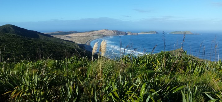 Van onze buurman krijgen we de tip om de wandeling naar Cape Reinga te maken. De gehele wandeling is voor Jeroen wegens enkelproblemen te ver, maar een deel ervan zien we wel zitten. Het pad gaat steil omhoog de kliffen op en binnen een halfuur hebben we al een magistraal uitzicht op de baai beneden ons. Nog een halfuur verder zien we in de verte de vuurtoren op de kaap staan. Als we ons een kwartslag draaien, zien we de hoge duinen van de westkust. We beklimmen een heuvel om de duinen nog beter te kunnen zien. Daarvoor struinen we door dicht struikgewas tot Jeroen opeens zegt: ”Kijk, een wild varken!” Later zien we er nog meer en zien we ook de sporen van hun gegraaf en gewroet.
