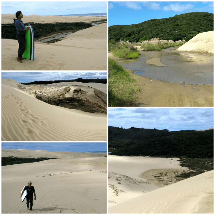 Met enige weemoed nemen we afscheid van Tapotupotu Beach, rijden de gravelweg weer omhoog en komen na een half uur rijden aan bij de hoge zandduinen die we al vanuit de verte hebben gezien. Ze zijn inderdaad imposant, zo’n 150 meter hoog en hun gele kleur steekt fraai af tegen de lucht. We hebben gelezen dat je hier kunt zandsurfen. “Ik heb dat gezien op tv, bij 3 op reis,” zegt Ina, “Floortje ging met een sandboard keihard naar beneden!”