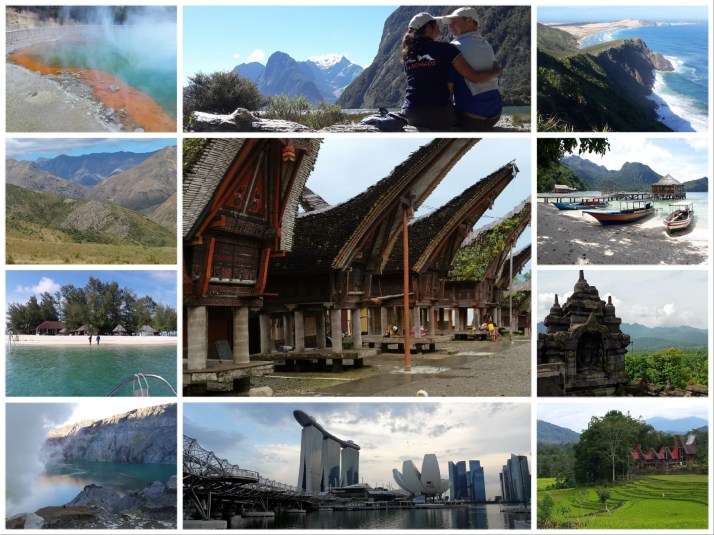 Langzaam wordt het donker en gaat de verlichting aan. De rondvaartboot-jes varen af en aan en een volle maan komt op boven het Marina Bay Sands Hotel. De gekleurde verlichting van het hotel wijzigt regel–matig. Het is een prachtig feeëriek gezicht en dan moet de lasershow nog beginnen! We zitten hier heer-lijk en bestellen nog maar een drankje. Dan begint de muziek te dreunen en schieten felgekleurde laserstralen van het dak af over de baai en de fonteinen spuiten op de maat van de muziek. Het is een passend spectaculair sluitstuk van onze vier maanden durende reis door Indonesië en Nieuw Zeeland! We pikken onze rugzakken op uit het hotel en vertrekken naar de luchthaven Changi Airport. In de vertrekhal kunnen we geen douches vinden om ons te verfrissen, maar het ruime invalidentoilet heeft een grote wastafel en dus kunnen we ons prima wassen en schone kleren aantrekken. Na het omwisselen van de laatste dollars zijn we klaar voor de reis. In de ochtend van 29 april komen we aan op Schiphol, kopen een treinkaartje naar Assen en kijken vervolgens vanuit de treinraampjes naar een grijs en vlak landschap. Tja, dat is even wennen! Vanuit Assen nemen we de streekbus naar Gieten en daar staat onze buurvrouw ons op te wachten om ons naar huis te brengen: Gieterveen. We verblijven twee weken in de bungalow op ons land, want ons woonhuis hebben we voor een langere periode verhuurd. Half mei vertrekken we weer, nu richting Zuid-Frankrijk. We gaan wonen in ons huis in de Franse Drôme, een nieuwe levensfase breekt voor ons aan!
