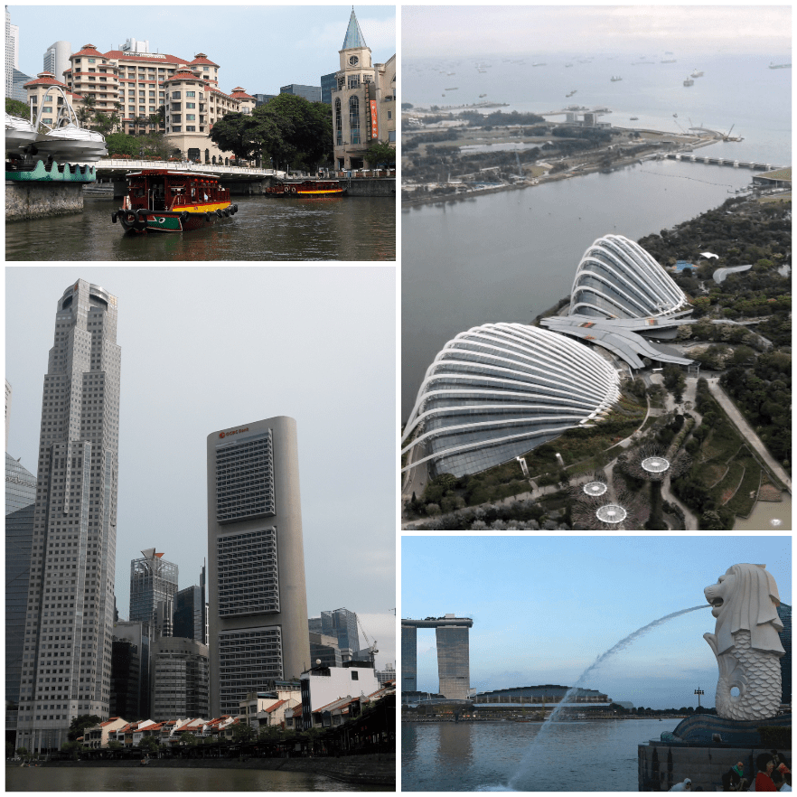 We hebben nog één hele dag te besteden in Singapore, want ons vliegtuig vertrekt pas om 01.30 uur. Wel moeten we om 10.00 uur al onze kamer uit en we regelen dat we onze rugzakken bij de receptie mogen laten staan om die vanavond op te halen. We gaan weer het centrum in om de toerist uit te hangen: een rondvaarttocht over de Singapore River en Marina Bay. Daarna borrelen op Skypark, het dak-terras van het Marina Bay Sands Hotel. Het boottochtje over de Singapore River brengt ons langs de oude handelsmarkt. Hier staan ook nog de oude gebouwen uit die tijd. We varen langs het standbeeld van Thomas Raffels en de Shophouses waar nu allemaal restaurantjes in zijn gevestigd. Vlak daarachter rijzen de torenflats omhoog, waardoor oud en nieuw in één oog-opslag te zien zijn.