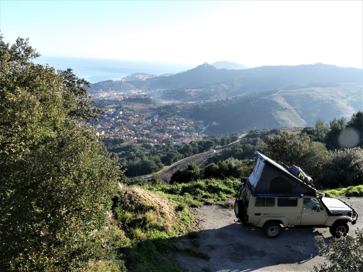 Vandaag willen we de ‘Côte Vermeille’ in Zuid Frankrijk bereiken en voor de grens van Spanje ergens de nacht doorbrengen. Het is nog een hele rit vanaf Baron. Aan het eind van de middag zien we in de verte de Pyreneeën. Via de app ‘Park4night’ vinden we een plekje bij het stadje Collioure aan de Middellandse Zee dat we net voor het donker bereiken. De parkeerplaats is helemaal leeg, echter de slagboom met hangslot belemmert ons de doorgang. Jammer! Met onze 4×4 kunnen we met gemak over het talud, maar we schatten in dat dat niet de bedoeling zal zijn. Aan de andere kant van de weg is ook een parkeerplaats. We rijden er naar toe, maar stuiten op het bordje ‘verboden te kamperen’. Opnieuw openen we de app en we zien dat er een derde plaats is op de berg boven het stadje. Dit keer geen slagboom. Wel een Frans echtpaar dat ons welkom heet. ‘Bienvenue!’ Ze zijn net terug van een wandeling en ze wensen ons een fijne avond. Jeroen klapt het dak open en Ina kookt een potje die we binnen nuttigen met uitzicht op de lichtjes van het stadje. We maken het niet laat en we duiken het bed in.