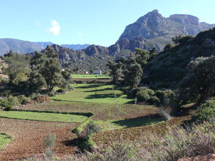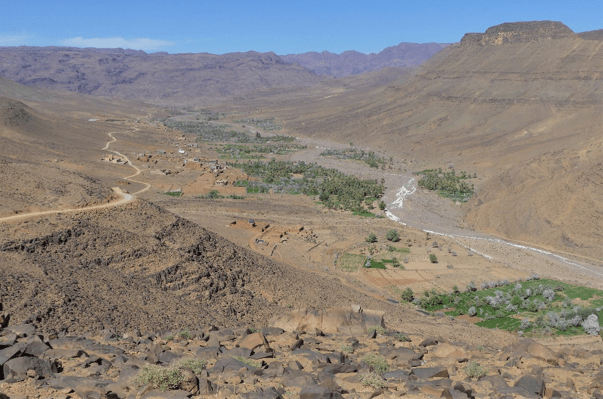 De route gaat door een lange en smalle vallei die langzaamaan stijgt en soms kleine gehuchten passeert. Rondom ons torenen de rotsen in grillige vormen. Regelmatig moeten we een waterloop oversteken en we zijn verbaasd dat er zoveel water in staat. Volgens onze OsMand app doen we de volgende dorpen aan: Tiguiza, Berkik, Akerkour, Talalait, Taoudacht en Ighissi.