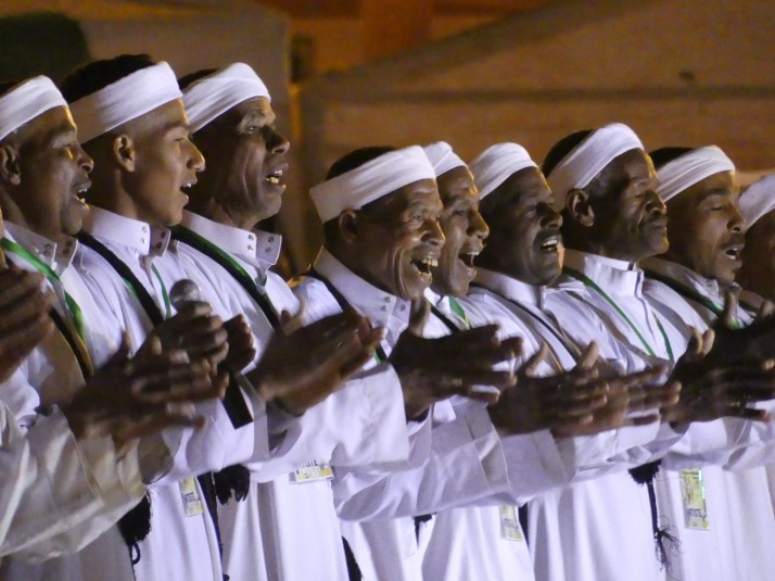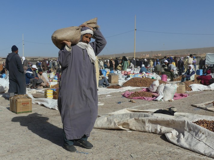 Eenmaal in de groene palmenrijke Dades-vallei valt ons de drukte en het toerisme op. Overal restaurants en hotels in de uitgestrekte oase. We rijden door naar Tinerhir en vinden een plaatsje op de volle en sjofele familiecamping Mabrouk tussen de vuilnisbakken en aanhangers. De zeer luidruchtige, naar ADHD neigende eigenaar spreekt een paar woordjes Nederlands. De hele familie woont en werkt op het campingterrein en in het bijbehorende restaurant. Ze hebben constant schreeuwend ruzie met elkaar. Om gek van te worden. ’s Avonds worden we door de zoon uitgenodigd om muziek te maken en tot 11 uur dreunen de trommels en djembé’s. De dames worden meegetroond en keren weer terug in Marokkaanse kledij en dan moet er worden gedanst. De familie weet naast ruzie maken ook sfeer te maken!