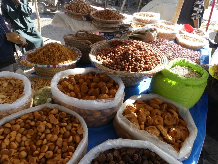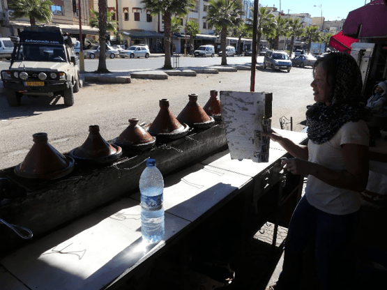 Het is gezellig druk in de hoofdstraat. Het ruikt verdraaid lekker naar eten en mannen doen zich tegoed aan een tajine of saté met het Marokkaanse ronde brood. Vrouwen gaan blijkbaar niet uit eten. Ze lopen wel op straat, doen boodschappen of helpen mee in de restaurants. Als we parkeren, proberen jonge dames ons te lokken naar hun eettentje. Het is inmiddels al lunchtijd, hoewel je in Marokko op elk uur van de dag wel kunt eten. We stoppen bij Samira, een vrolijke meid. Jeroen gaat pinnen en Ina knoopt een gesprekje met haar aan. In onze auto staat Arabische muziek op en ze vraagt Samira waar ze over zingen. Het gaat over de liefde. Ze maakt spontaan dansbewegingen met haar hand en sommeert Ina haar na te doen. Samira lacht hartelijk en laat blijken dat Ina het goed doet. Met veel plezier geven we elkaar een ‘high five’. Op dat moment komt Jeroen terug en zegt dat we weer verder kunnen gaan. Dat gaat nog niet gebeuren volgens Samira. Ina moet uitstappen en kijken wat voor lekkers er in de tajines zitten. Het ruikt heerlijk en ook de saté staat uitnodigend klaar. Toch laten we ons met moeite niet verleiden om een hapje te eten. Bovendien hebben we nogal laat ontbeten. We willen door. Eerst nog brood kopen. Samira neem Ina mee. Samen lopen we door het huis vier trappen af en bereiken de straat aan de achterkant van het gebouw waar de bakker is. Samira roept iets in het Arabisch naar de eigenaar en krijgt een voor ons het bekende ronde Marokkaanse brood. Ina mag onder geen beding iets betalen, ook niet het parkeergeld. De 6 dirham (60 cent) blijft in de portemonnee. “Vergeet mij niet en kom nog maar een keer terug om bij mij te eten”, zegt ze lachend. Wat een lief mens!
