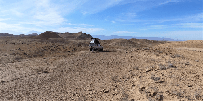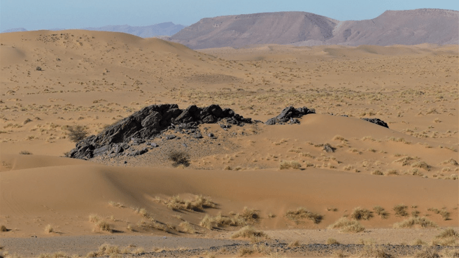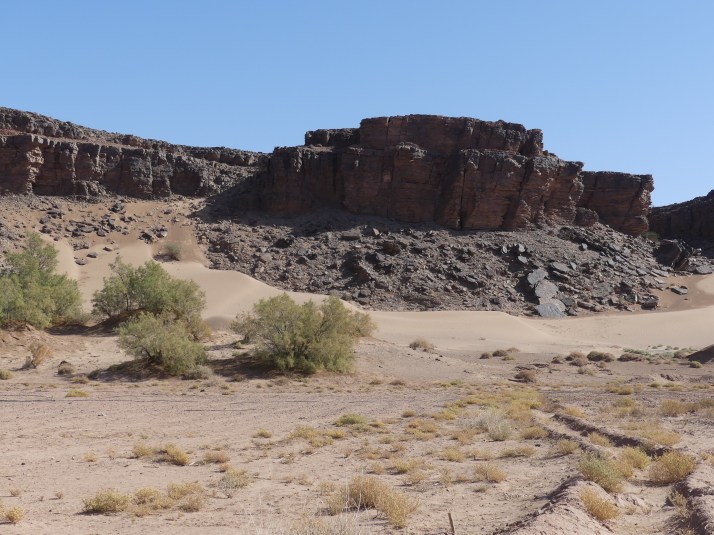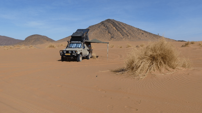 Regelmatig steken we een drooggevallen meer over en dat zorgt voor enorme stofwolken. Het zand kleurt hier haast oranje en dat steekt prachtig af tegen de zwarte rotsen. Ook zien we een kenmerkende ‘tajine-berg’. In de buurt bij Ouzina zoeken we weer een bivakplek en het lijkt ons leuk om in de duinen te gaan staan. Jeroen ziet een gelegenheid en draait de Toy het duin op. Het zand wordt steeds zachter en de banden zakken diep weg, dus gaan we voor de zekerheid eerst op verkenning uit. Het blijkt dat als we iets doorrijden, we op een redelijk vlak stuk komen met een magistraal uitzicht over de vallei en de tajine-berg. De Toy trekt zich door het zachte zand en we kunnen ons installeren. Met een glaasje pastis in de hand zien we de ondergaande zon die alle kleuren nog sprekender maken. Links en rechts zien we de donkerkleurige bergen. Een schril contrast met de gele duinen voor ons. Oh, wat mooi!