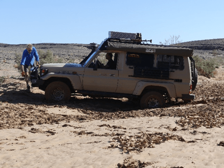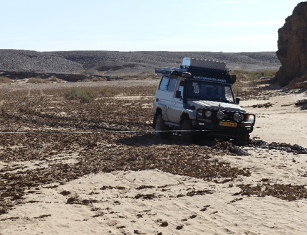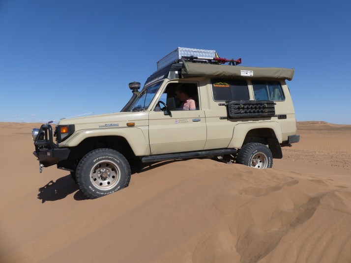 Na het ontbijt breken we op. We stappen de auto in en rijden westwaarts. Paul vraagt ons of we in het zand willen rijden. Natuurlijk willen we dat. De banden worden afgelaten, lucht uit de banden gehaald waardoor we vanwege een groter bandoppervlakte meer grip in het zand hebben. En rijden in 4Hoog. Paul zet koers recht op een stel duinen. Duintje op, duintje af, duintje op, duintje af. Rijden door het zand voelt fantastisch. Je zoeft als het ware.