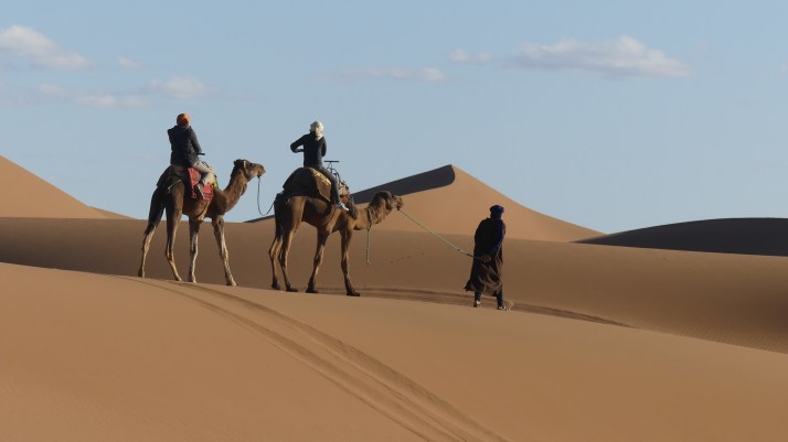 De route volgt verder over de zandpiste. We genieten er enorm van. Dan rijdt Paul zijn auto naar een paar duinen en bomen. Het lijkt hem een goede bivakplaats. Mooi gevonden! Verderop loopt een kudde dromedarissen. Soms is er een herder. Als die ontbreekt, zijn de voorpoten aan elkaar vastgebonden om ver weglopen te verhinderen. Als je die beesten ziet, zit je relatief gezien niet ver van de bewoonde wereld. In de verte zien we M’Hamid El Ghizlane liggen, in de volksmond genoemd M’Hamid. We planten de stoelen op het topje van de duin en kijken naar de beesten en de zonsondergang. Prachtig plaatje, hoor. Buiten zitten wordt al snel te koud. Paul en Jamiaa hebben hout meegenomen voor een kampvuur. Boven ons zien we oneindig veel sterren. Bijzonder dat hele volken aan de hand van de sterren hun route kunnen vinden. Wij doen het met een kaartje, GPS, of nog beter, gewoon achter Paul en Jamiaa aan rijden.