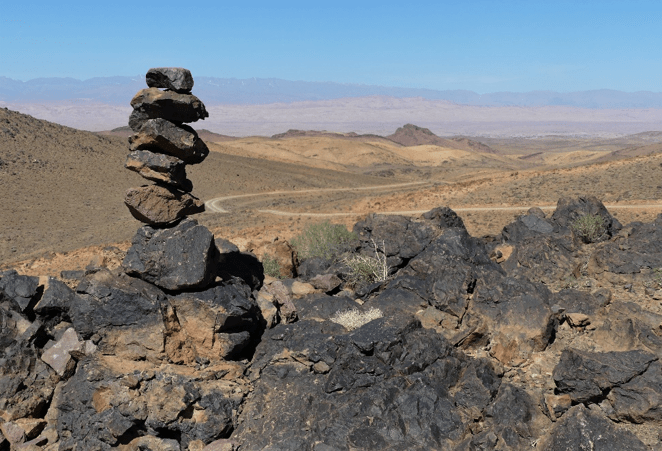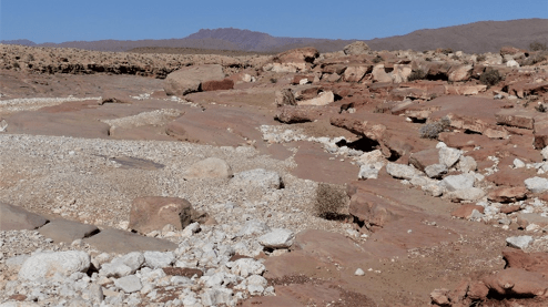 We rijden door een vlak stenig gebied met weinig variatie. De heuvels zijn op enige afstand en er is nagenoeg geen begroeiing. Midden op de vlakte komen we bij een verkooppunt van fossielen en bijzondere stenen. Het ligt uitgestald op een tafeltje en de tekst erbij maakt duidelijk dat de eigenaar een Berberse herder is. Hij heeft deze extra inkomsten hard nodig om te kunnen overleven in de harde omstandigheden van de woestijn. De dirhams kunnen in een potje. Dank voor uw bijdrage.