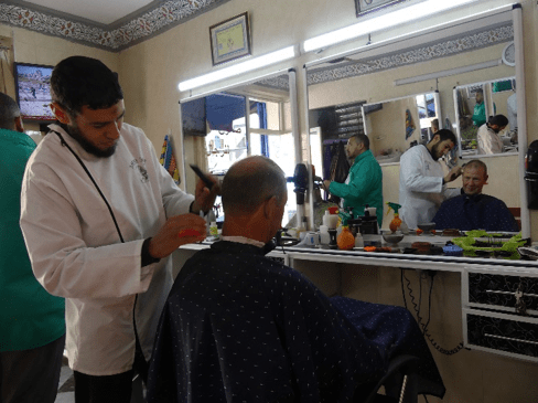 Er zijn hoge trottoirs, de straten zijn schoon en het plein bij de bushalte is alleen voor voetgangers toegankelijk. Overigens zien we dat alle hoofdwegen in Marokko er zo ordelijk uit zien. Eerst maar richting het café voor een nos-nos. Maar welk? Bijna in elke straat vind je er wel één tot vijf. De stoelen worden bezet door veel thee drinkende mannen en enkele frisdrank drinkende toeristen. De keuze is snel gemaakt en we nemen plaats aan de hoofdstraat waar het verkeer in auto’s, vrachtwagens, op brommers, fietsen en ezels af en aan rijden. We lijken wel bermtoeristen, maar voor deze keer deert ons dat in zijn geheel niet. De uitlaatgassen nemen we voor lief. Hier (nog) geen gedoe over de uitstoot van stikstof. De ober komt naar ons toe en al wrijvend over de tafel met een onbestendig doekje, neemt hij de bestelling op. “Deux nos-nos s’il vous plait.” De man knikt en loopt het café in. Wachtend op ons drankje dringt een zoete bakgeur onze neuzen binnen. Jeroen neemt poolshoogte en hij vertelt dat een man naast ons appelbeignets bakt. “Marokkaanse appelbeignets?”, vraagt Ina, “dat moet geproefd worden.” Voor 10 cent smikkelen we allebei een beignet op die samen met de koffie heerlijk smaakt. Na een tweede nos-nos doen we de boodschappen en keren we terug naar de camping. Als Ina het achterwiel van de Brompot uitklapt, begint een man aan de overkant luid en hartelijk te lachen en hij steekt zijn duim omhoog. Ook zijn buurman ziet het. Voor de lol haalt Ina nogmaals dit trucje uit. Ze verbazen zich zichtbaar over onze fietsen en zwaaien ons na als we wegrijden. Die hebben een mooi verhaal te vertellen als ze thuis komen.