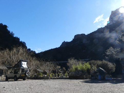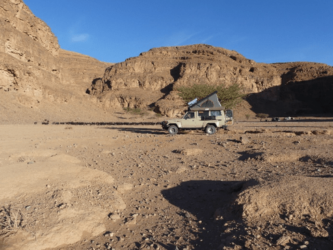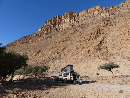 De vallei wordt gaandeweg steeds smaller en de piste steeds steniger, waardoor we slechts langzaam vorderen. Het loopt al tegen het borreluur, dus de hoogste tijd om een slaapplaats te vinden. De weg maakt een haarspeldbocht naar rechts en dan ziet Jeroen links van hem net naast de piste een rotspunt. “Borreltijd. We zijn er!”, zegt hij enthousiast. We maken ons bivak op 1590 m hoogte, vlak voor het dorpje Assaka n’Aït Ouzzine.