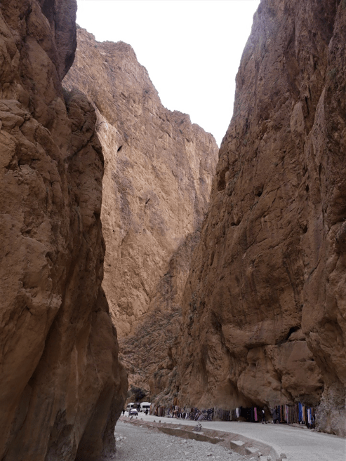 Tinerhir ligt aan de ingang van de Gorges du Todra en deze kennen we nog niet echt. Dus gaan we door de kloof om vervolgens de Haut-Atlas in te rijden. Het begin is meteen spectaculair met hoge verticale wanden in een diep roodbruine kleur. Op de bodem stroomt veel helder water en de weg slingert zich door de kloof. Her en der staan verkopers met prullaria. Dit is duidelijk een toeristische hotspot, want we zien bussen en huurauto’s vol met toeristen van verschillende nationaliteiten. Maar al met al toch de moeite waard.