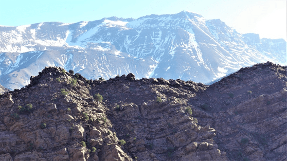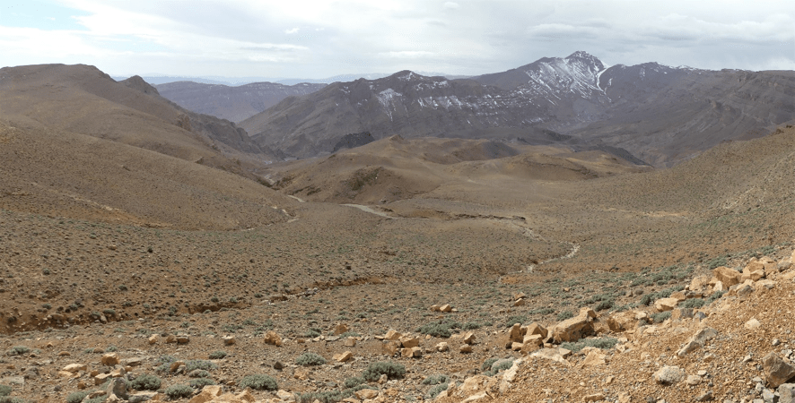 De kronkelende piste blijft een beetje van dezelfde povere kwaliteit en we vorderen langzaam. Niet erg, want daardoor kunnen we goed de prachtige omgeving in ons opnemen. Na Tagemout wordt het landschap breder en we verwachten dat onze voorgenomen route naar Skoura minder interessant zal zijn dan een doorsteek noordwaarts naar El-Kalaâ M’Gouna. Dus wijzigen we de plannen en daar hebben we geen spijt van. We rijden aanvankelijk sterk omhoog over een bergketen en zien dan in de verte de Haut-Atlas met besneeuwde toppen liggen. Vanaf dit punt gaat het gestaag omlaag en we zien het geleidelijk steeds groener worden met pollen kamelengras. Een prachtige afdaling richting de Vallée du Dadès.