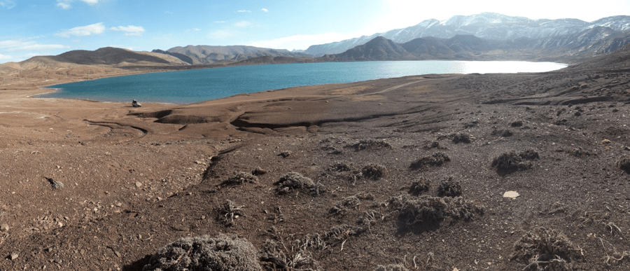 Bij Imlichel gaan we een piste op, want we kregen de tip dat je mooi kunt bivakkeren bij één van de bergmeren. We gaan over de oever en vlak langs het water voorbij aan het Lac Tislit en rijden door naar Lac d’Isli. Het is een groot meer, geflankeerd door een bergketen met sneeuw. Een ijskoude wind blaast over het fel blauwe water. De oevers zijn roestbruin van kleur. We vinden het prachtig en bereiden ons mentaal voor op een koude nacht. We zijn namelijk op 2500 m hoogte. In de verte staan twee tot camper omgebouwde vrachtwagens en later passeren ons nog twee Toyota’s die ook een plekje zoeken. Ze verdwijnen uit het zicht en we zien ze pas de volgende morgen weer langsrijden.