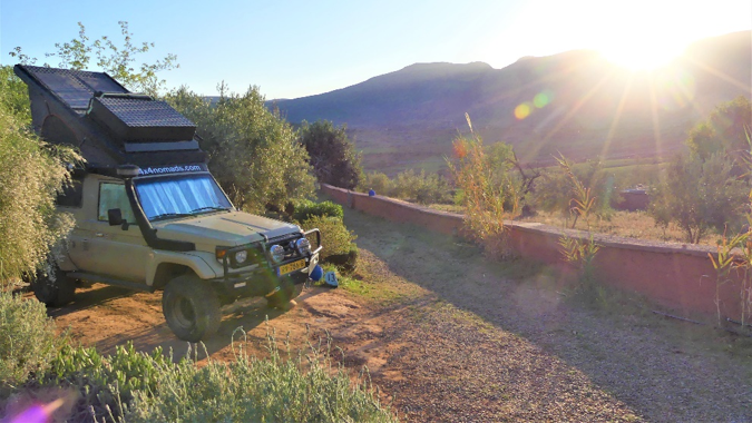 Het wordt al bijna donker en we naderen Zagora. Een Landrover Defender 110 komt ons tegemoet met knipperende koplampen en luid getoeter. Geen idee wat hij wil en we rijden door. In de achteruitkijkspiegel zien we dat de auto draait en al snel achter ons rijdt. Toch maar even vragen wat er aan de hand is. Hij stelt vragen over onze Toyota en hij geeft Jeroen het visitekaartje van Ali Nasser, eigenaar van een garage in Zagora gespecialiseerd in Toyota’s. We zien zijn naam op de auto staan. “Als hij gespecialiseerd is in Toyota, waarom rijdt hij dan in een Landrover?”, vraagt Ina zich bedenkelijk af. Het maakt niet uit. Al die garages zijn gespecialiseerd in 4×4-terreinwagens. De man wil ons naar de garage brengen, maar het avondrood is al bijna verdwenen. Misschien komen we morgen zelf wel langs.