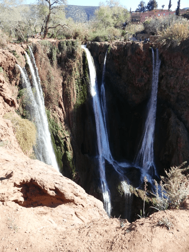 De omgeving van Ouzoud is bijzonder fraai, heel groen, mooie bergen en uiteraard de fameuze watervallen om de hoek. Het stadje draait daardoor volledig op het toerisme. Op de fiets rijden we in 5 minuten de heuvel af naar Ouzoud. We fietsen eerst aan de rechterzijde over een voetpad langs de watervallen die inderdaad spectaculair zijn. Van grote hoogte storten verschillende stromen in de diepte. Aan de andere zijde kan men afdalen via trappen die zich tussen talloze toeristische winkeltjes door slingeren. Een gezellige drukte met vooral Marokkaanse toeristen. Op de bodem van de watervallen zijn grote poelen ontstaan en met roeiboten worden klanten dichtbij de watervallen gebracht.