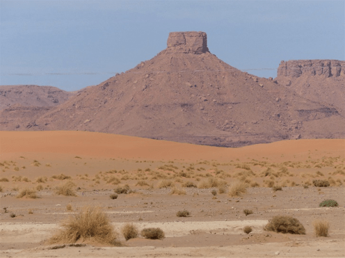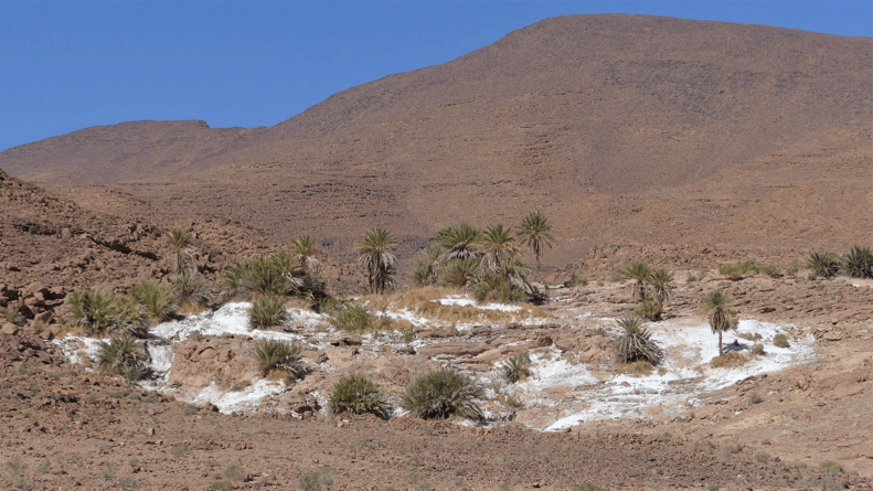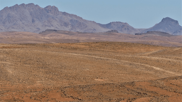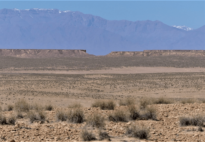 Voor ons doemt een berg op die ten zuiden van Foum Zguid ligt. Althans, het lijkt op een berg, maar is in werkelijkheid 640 m hoog. Paul vraagt op hoeveel kilometers afstand we ervan zijn verwijderd. We doen een gok. “Vijftien kilometer?” Mis gegokt. Het zijn er dertig. Onvoorstelbaar. We rijden er recht op af. Voor ons we zien de fata morgana, de luchtspiegeling, een verschijnsel waarbij er grote temperatuurverschillen bestaan tussen verschillende luchtlagen. Het lijkt werkelijk op een meer en als we even doorrijden, is het plotseling verdwenen. Na het Lac Iriki stelt Paul voor om niet over de steenpiste naar Foum Zguid te gaan. Wij vinden dat prima, want deze hebben we al eens gedaan. Bovendien houden we niet zo van dit soort pistes en proberen het zoveel mogelijk te vermijden. Slecht voor je banden en vermoeiend rijden.