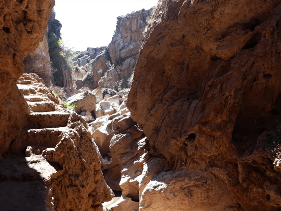 De goede piste vervolgt zich slingerend door een soort canyon-landschap, heel bijzonder. De rotsen zijn geel-oker van kleur en de namiddagzon versterkt dat nog eens. We maken teveel foto’s en video’s en schieten dus totaal niet op, maar genieten volop.